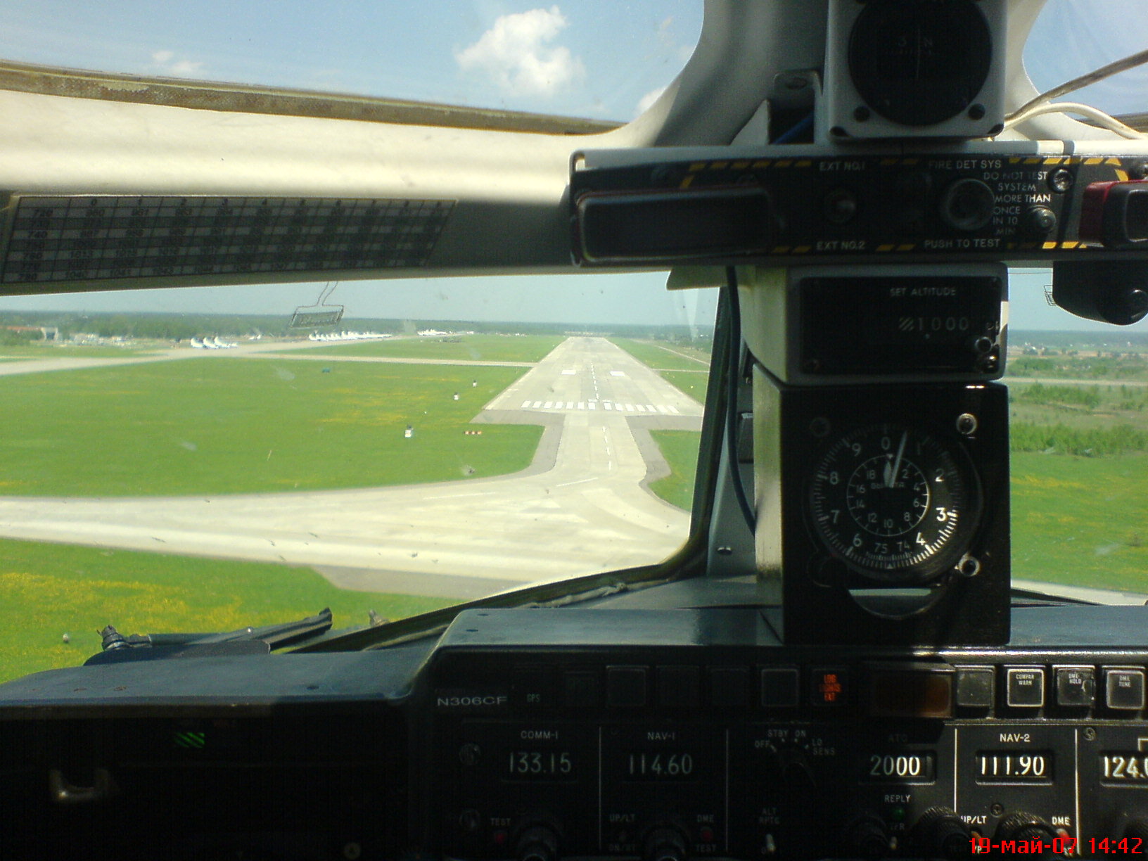 Во второй вылет взяли меня и еще пару человек на пассажирские кожанные кресла. Я, естественно, на кресло второго не претендовал, выполял роль штурмана. Стоял на приступочке в кабине, между креслами пилотов: слева Апарин в роли КВС, справа Дима. На мне контроль параметров полета. Разбег, отрыв, смотю на стрелку вариометра и ничего не понимаю…. показывает 40-45… потом оказалось, что это футы в минуту, которые при переводе надо делить на два. Та же фигня со скоростью — вроде несемся, как в ракете, а на приборе всего лишь 250. Оказалось, что это мили. Сам самолет потрясает своей управляемостью и мощью двигателей. пришли в третью зону (над Нарскими прудами) и начали там виражи выделывать с любыми кренами — хоть бы что, скорость стоит как вкопанная. Пробовали свалить его, режим малый газ, скорость к 110 подходит… 107…105…. 100…. в это время штурвальные колонки сами отдаются от себя (автоматика сработала), самолет даже не задрожал! Птица, короче.