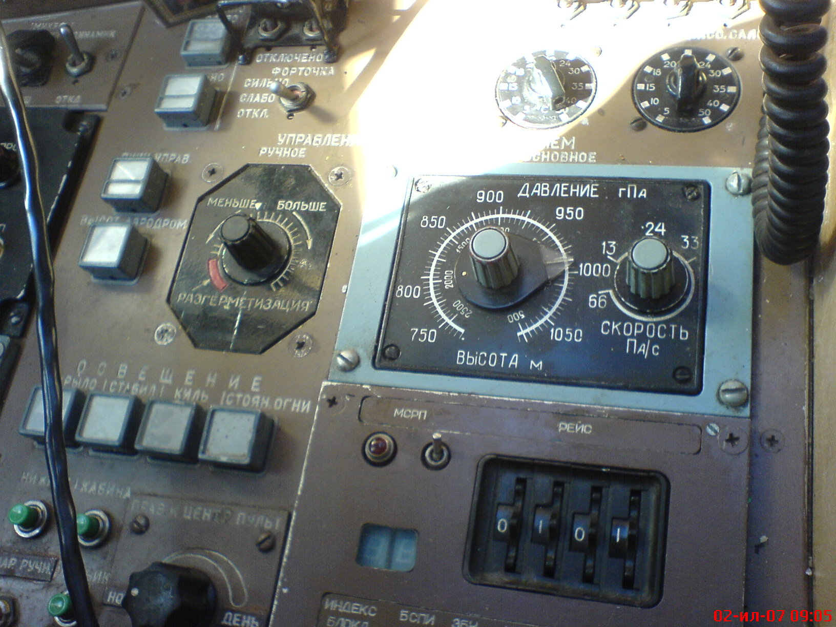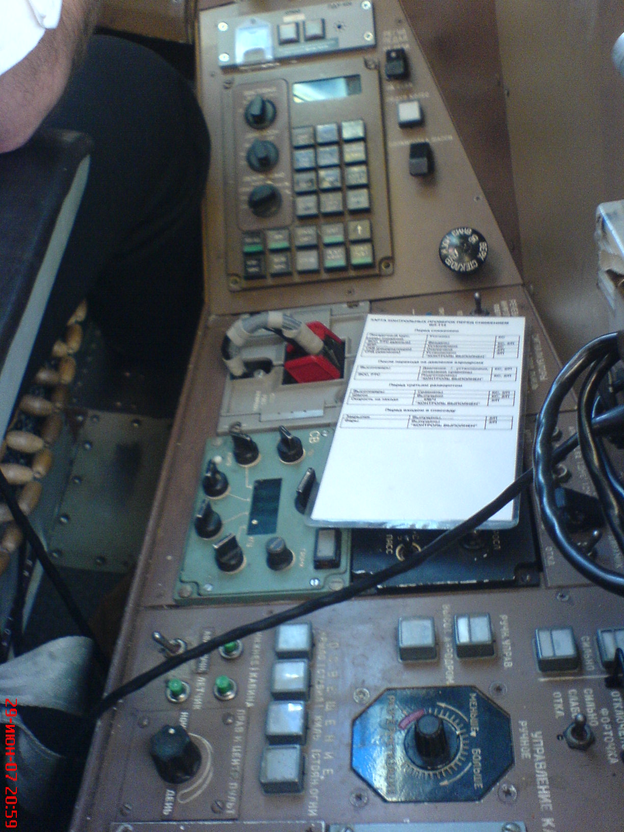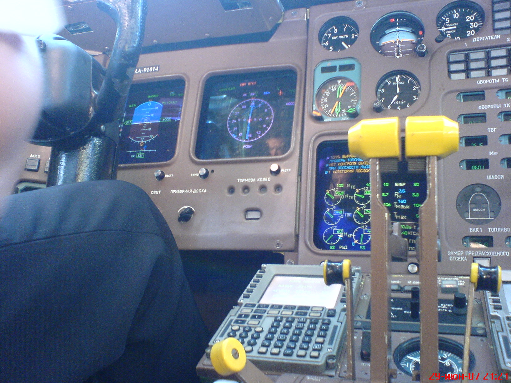 Как я попал в кабину — это отдельная история, братство пилотское выручило. Кабина удивила практически полным отсутствием стрелочных приборов. Их оказалось всего лишь 5 (пять!) и это были дублирующие приборы «классики» — скорость, высота, вариометр, АРК, авиагоризонт. На самом деле в полете на них смотрел только я, потому что мне они понятны и близки. Экипаж пользуется большими цветными экранами (к сожалению, не ЖКИ, поэтому отсвечивают они получше любого зеркала, ЖКИ стоят уже на следующих модификациях). У каждого члена экипажа два экрана, на который можно вывести любую информацию из существующего набора (всего кажется около 10 разных скринов). Классический основной экран — это базовые параметры полета (АГД, скорость, высота, вариометр и т.д.). На втором экране чаще всего ставят ПНП (планово-навигационный), показывает направление, рассчитывает боковое уклонение, все расстояния до точек и т.д. Кроме этого, третий важный экран — это локатор. Красивый, зараза… Мне не довелось увидеть, как смотрится картинка в перископе старых локаторов (которые на «тушках» раньше стояли и на всех старых советских самолетах), но на экране все отлично — показывается цветная картинка, там где зеленое — все ровно, где есть проблемы — желтое и оранжевое. А малиновым цветом показываются засветки. Кроме этого, на экраны можно вывести конфигурацию самолета (реально нарисованный профиль самолета с визуальным отображением состояния шасси и механизации), отобразить вспомогательные системы (кондиционирование, обдув кабины и т.д.), вывести параметры работы двигателей (в постоянном режиме есть еще пятый экран между пилотами, где выводится информация о работе двигателей) и т.д. Мне кажется, что если бы эти экраны еще были бы сенсорными, я бы полностью поверил в торжество прогресса, но даже увиденного было предостаточно. За фотки извиняюсь, но кроме мобильника ничего под рукой не было…
