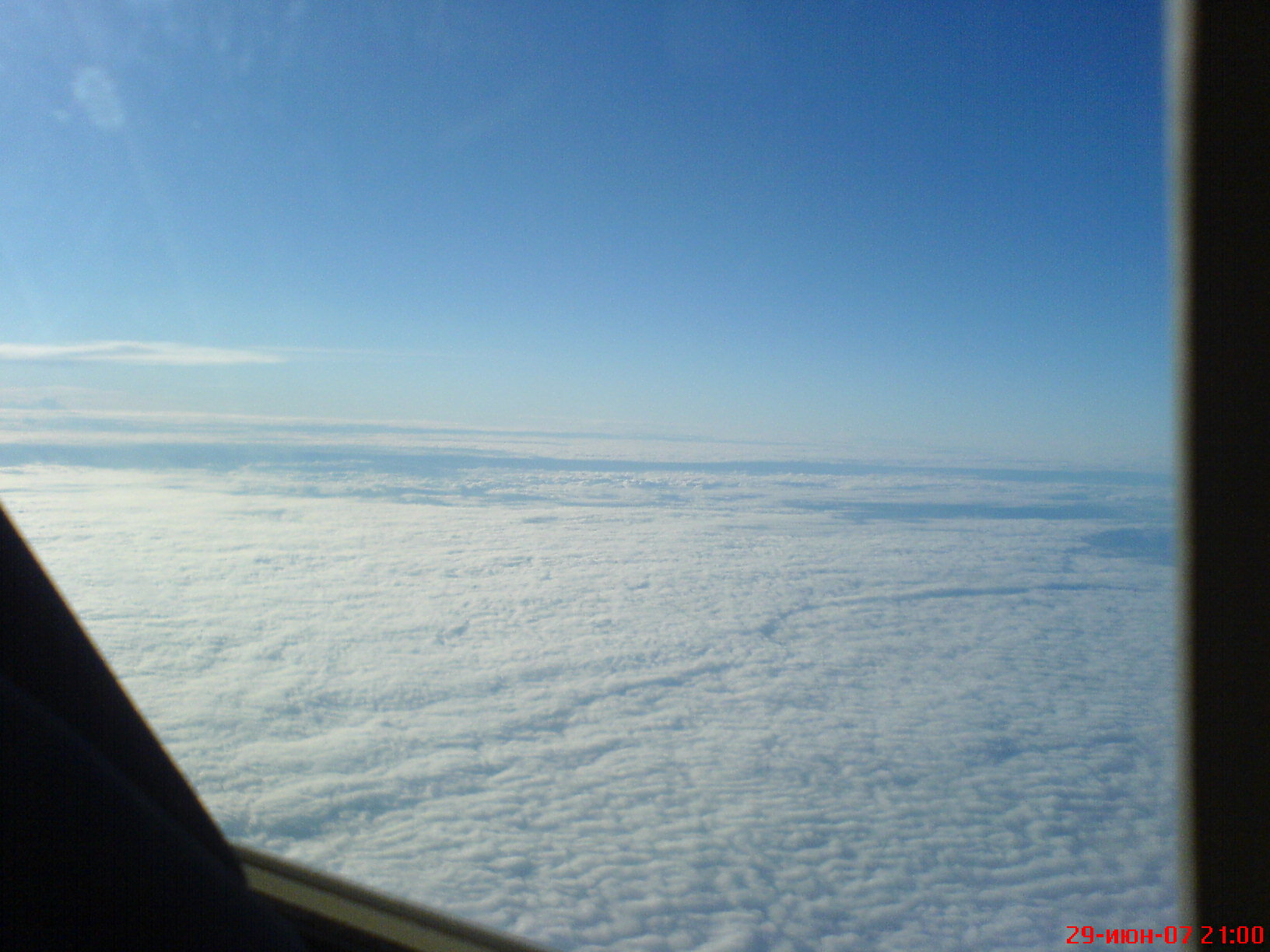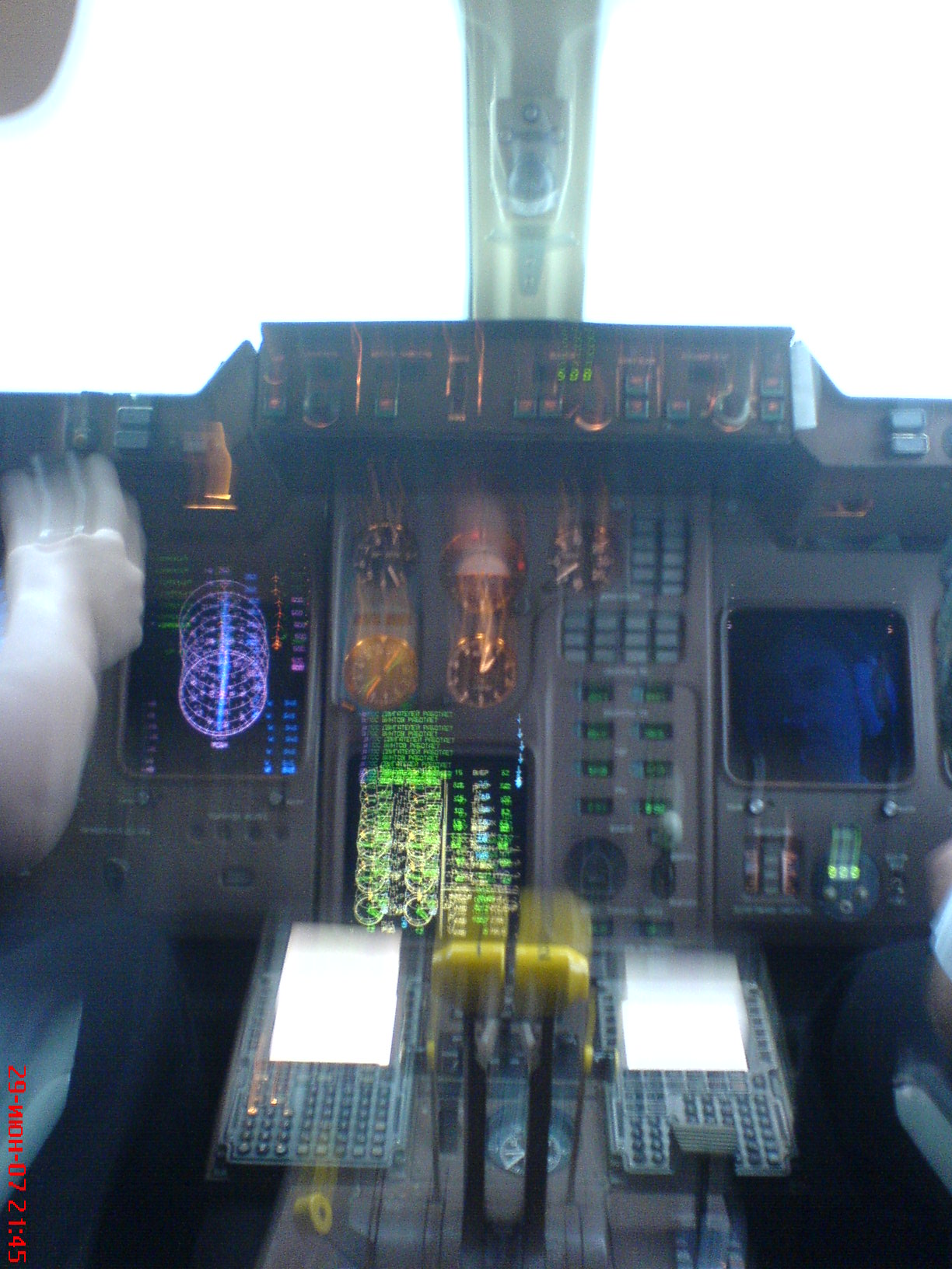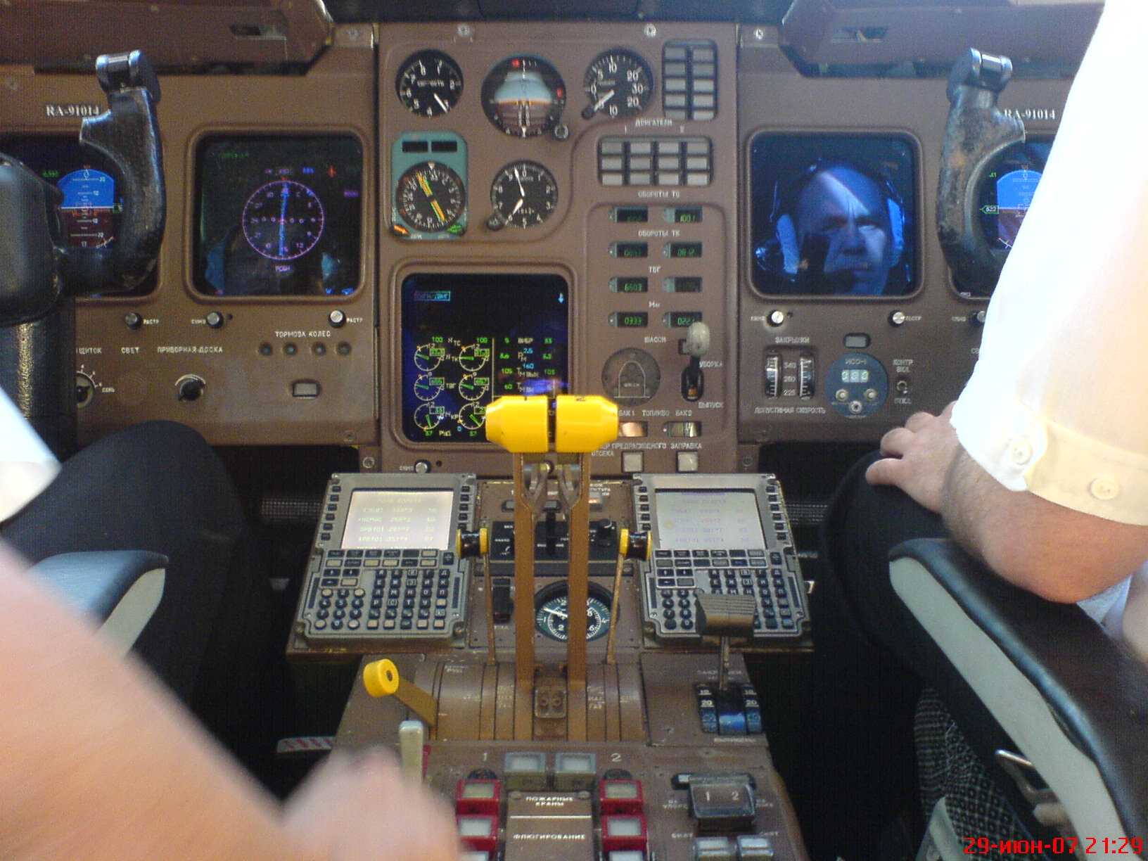 Впечатления от самого полета в кабине тоже удивительные. Во-первых обзор во все стороны. Из иллюминатора видна только часть пейзажа. Из кабины можно увидеть все (кроме хвоста)). Виды облаков, пейзажи (особенно грозовая кучевка) — просто восхитительны. Особенно впечатлил момент, когда влетали в грозовые облака на снижении. Стоит такая грозная стена перед глазами, влетаешь в нее и начинается болтанка. В самом облаке — вокруг ничего не видно, только струи дождя по стеклам и темно, как будто сумерки. Зато заход на посадку и посадка — все как всегда вроде, но в тоже время не так. На моем ЯКе у меня глиссада короткая и крутая. На этом лайнере глиссада длинная, подход как бы мягкий, медленный, течет во времени. И сама посадка тоже довольно длинная по времени, длительное выдерживание, самолет висит в воздухе, пилоты усердно работают штурвалом по крену, и плавно подводят-подводят-подводят, фуф…. у меня бы за это время самолет 5 раз бы сел и я бы успел конвеером уйти. В общем, интересного много. Хочу еще:)