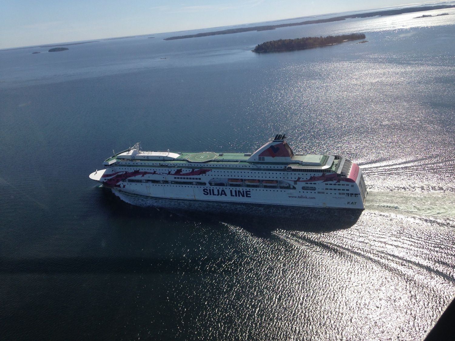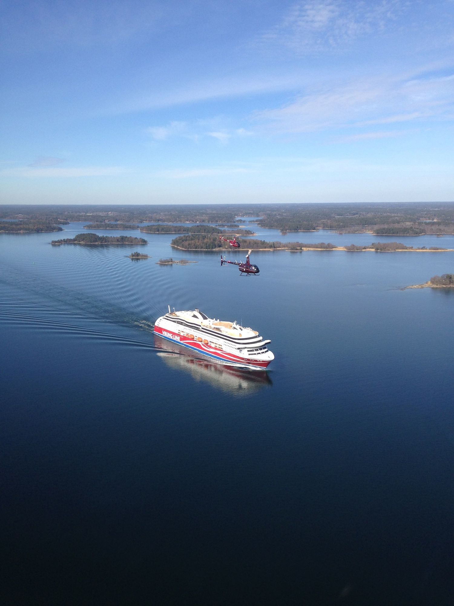 А на следующее утро наши вертолеты уже вовсю рассекали в сторону Мариенхамн — еще одного острова в Балтийском море, который расположен между Швецией и Финляндией и является по сути автономией в составе финляндии. Маршрут до Мариенхамна сказочно красив, потому что проходит над каналом между островами, тем самым каналом, по которому паромы идут из Стокгольма в Хельсинки. По пути мы встретили несчетное количество этих паромов, и с некоторыми устроили целые фотосессии (надеюсь, отдыхающие на борту также сделали парочку снимков наших вертолетов, если кому попадется в сети — дайте ссылку, хочется посмотреть, насколько ровным строем мы летели)))).