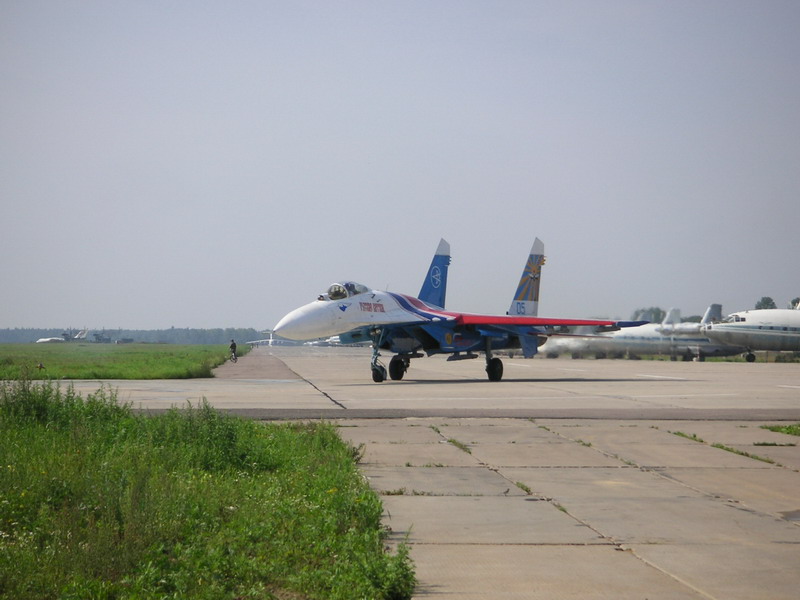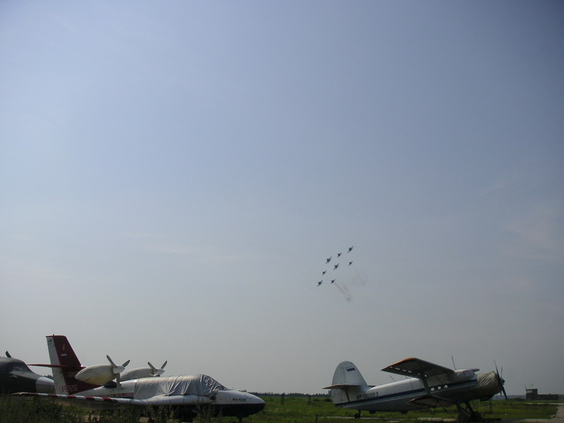 Я лично ждал группу «Русь». Это моя любимая пилотажная группа, даже более любимая, чем уважаемые мной «Стрижи» и «Витязи». Любимые именно из-за зрелищности своего выступления, какой-то хищности и грациозности. За 20 минут до прилета «Руси» удалось найти и познакомиться с начальником Вяземского учебного центра Казимиром Тихановичем. Узнал у него подробности насчет «как бы полетать на Л-39», выяснилось что без проблем, только это чуть ли не в два раза дороже будет, чем я летал в Абхазии, так что еще вопрос о целесообразности.