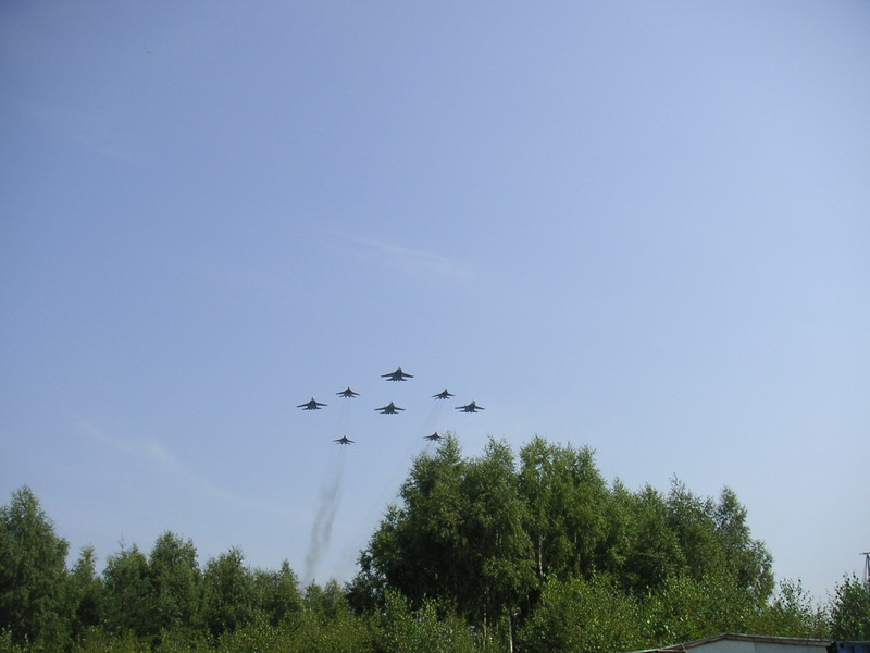 «Русь» как всегда порадовала и одновременно огорчила, потому что некогда великая «девятка», сначала превратившаяся в «семерку», теперь выступает только «тройкой», потому что все остальные самолеты не прошли межресурсный ремонт. Блин, что творит наше государство? хотя чего я разоряюсь, ведь если бы не заявленный проход ромба над Красной площадью, то и «витязи» со «стрижами» сидели бы на земле со своими редкими тренировками. В любом случае, выступление «Руси» было одним из ярчайших пунктов в программе авиашоу. Надеюсь, мне удастся смонтировать видео с их выступлением и выложить его тут.