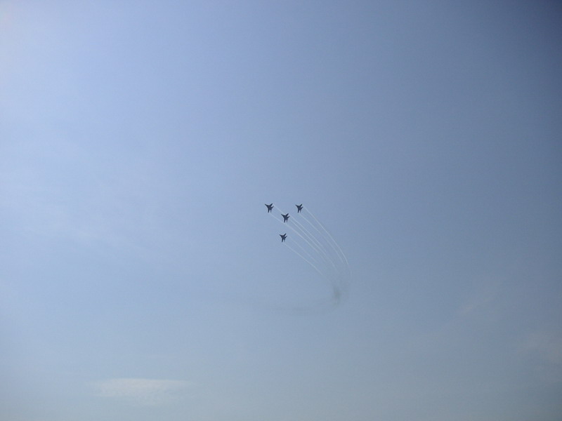 Четвертое, что понравилось ОЧЕНЬ — это групповой и одиночный пилотаж на ЯК-52. Тут, правда, тоже не обошлось без накладок. Должна была лететь пятерка ЯКов, но у одного вдруг забарахлила свеча на одном из цилиндров. В итоге решили лететь четверкой. Сан Саныч Горнов, Олег Шполянский, Никитин (?боюсь ошибиться в фамилии) и Андрей Палыч хвостовым (вместо клина — ромб). Договорились, вырулили, взлетели… Смотрю, Андрей Палыч как-то все отстает-отстает-отстает… На первом уже прилично так. В общем, через пару минут стало ясно, что от пятерки осталась только тройка, потому что Палыч запросился к третьему и выпустил шасси. После посадки выяснилось, что компрессор не выдал нужного наддува и тяги банально не хватило, хотя самолет полностью исправен, но для пилотажа в группе выдаваемой тяги недостаточно. Как сказал Палыч, еще бы несколько минут и двигатель вышел бы на нужную мощность. Но…. пока он рулил, группа уже вовсю крутила пилотаж над точкой. Если честно, я впервые видел групповой пилотаж на поршневых самолетах и зрелище это не менее интересное, чем демонстрируют реактивные пилотажные группы. Конечно, динамика и скорость не та, но филигранность и слаженность действий, сложность выполняемых фигур вполне на высоте. После пилотажа «тройкой» группа распалась на пару и соло. Пара продемонстрировала еще ряд фигур, ну и под конец всех добил уже традиционный пилотаж Олега Шполянского, который на ПМВ (преступно малой высоте) продемонстрировал такой класс пилотирования, что и витязи со стрижами могли бы сильно подивиться, их то на такую высоту не пускают;) В общем, это было просто потрясающе, единственное о чем я жалел, что у меня не было камеры, т.к. с моей точки были видны такие ракурсы (пилотаж прямо над моей головой), которые сбоку никак снять не удается. Ну да ладно, надеюсь не в последний раз…